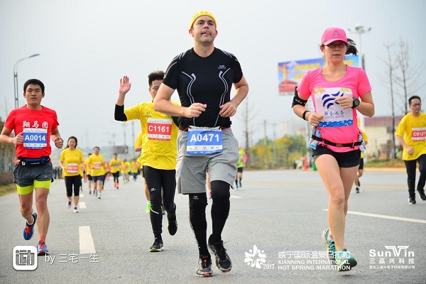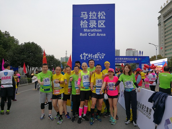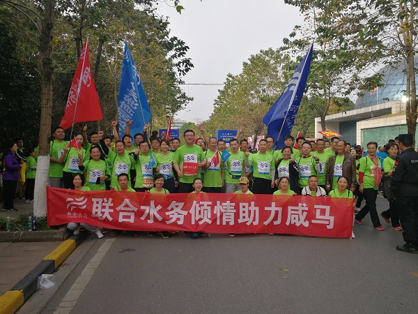 11月11日上午8点,2017年咸宁国际温泉马拉松赛在咸宁市人民广场鸣枪开跑,本次活动吸引了全世界的1.2万人参加,联合水务集团副总裁刘猛、陈樵、James Beeson先生及旗下6个项目公司的63名参赛队员汇集香城泉都,代表联合水务倾情助力本次马拉松大赛。 当天7:20,集团63名参赛人员和咸宁公司70名啦啦队和服务人员,在起点人民广场集中,高举“新起点、新征程、新时代、新作为”、“联合水务,服务咸宁”的横幅,大家步伐整齐,挥舞彩旗,方阵格外引人注目,为本届马拉松赛事增添了一抹亮丽的风景。