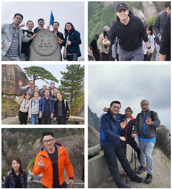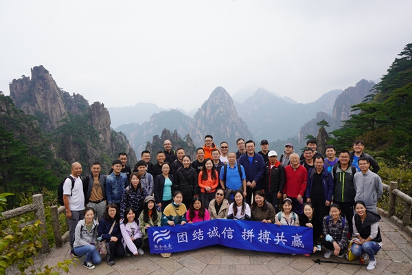 图:生日晚会掠影 晚餐进行过半,“生日快乐”的歌声骤然响起,餐厅里的气氛瞬间活跃起来。生日会上,寿星们在大家祝福的掌声中收获了俞总亲自赠予的书籍。展卷有益,享受阅读,快乐生活,这也是集团选择赠书的寓意所在。这场在黄山下丰乐湖畔举办的生日宴会,也让寿星们在团队中感受暖暖的人文关怀。 同心协力,勇攀高峰 以奇松、怪石、云海、温泉“四绝”著称的黄山,是大自然造化中的奇迹,被世人誉为“天下第一奇山”。明代大旅行家徐霞客曾两次登临黄山,叹道:“薄海内外无如徽之黄山,登黄山天下无山,观止矣!”后人据此概括为“五岳归来不看山,黄山归来不看岳”。黄山千米以上高峰72座,“莲花”、“光明顶”、“天都”三大主峰的海拔均逾1800米。此次团建需要挑战的主峰则是位于黄山中部的光明顶和莲花峰。