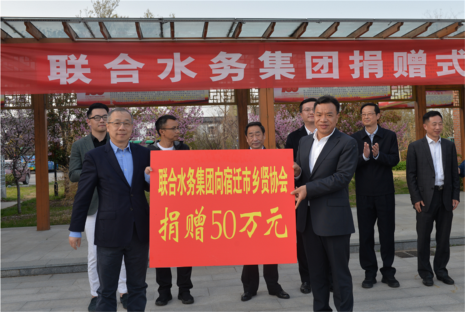 捐赠仪式现场合影 3月28日下午,联合水务集团董事长兼总裁俞伟景一行来宿考察乡贤义务护水工作,并向市乡贤协会捐赠人民币50万元为护水乡贤购买人身意外伤害保险。宿迁市政协副主席、党组副书记,市乡贤协会顾问华志明及市、区乡贤协会负责人出席捐赠仪式,共同见证这一神圣的时刻。